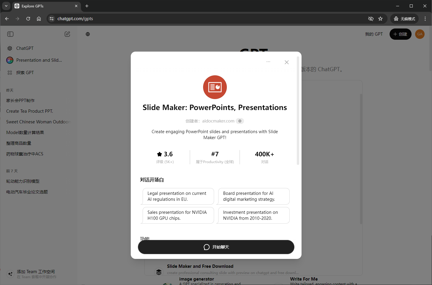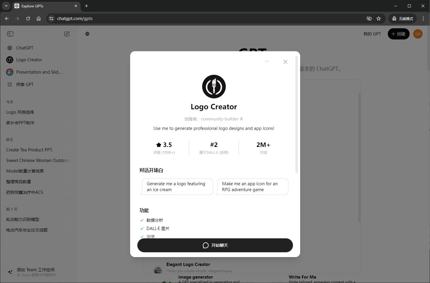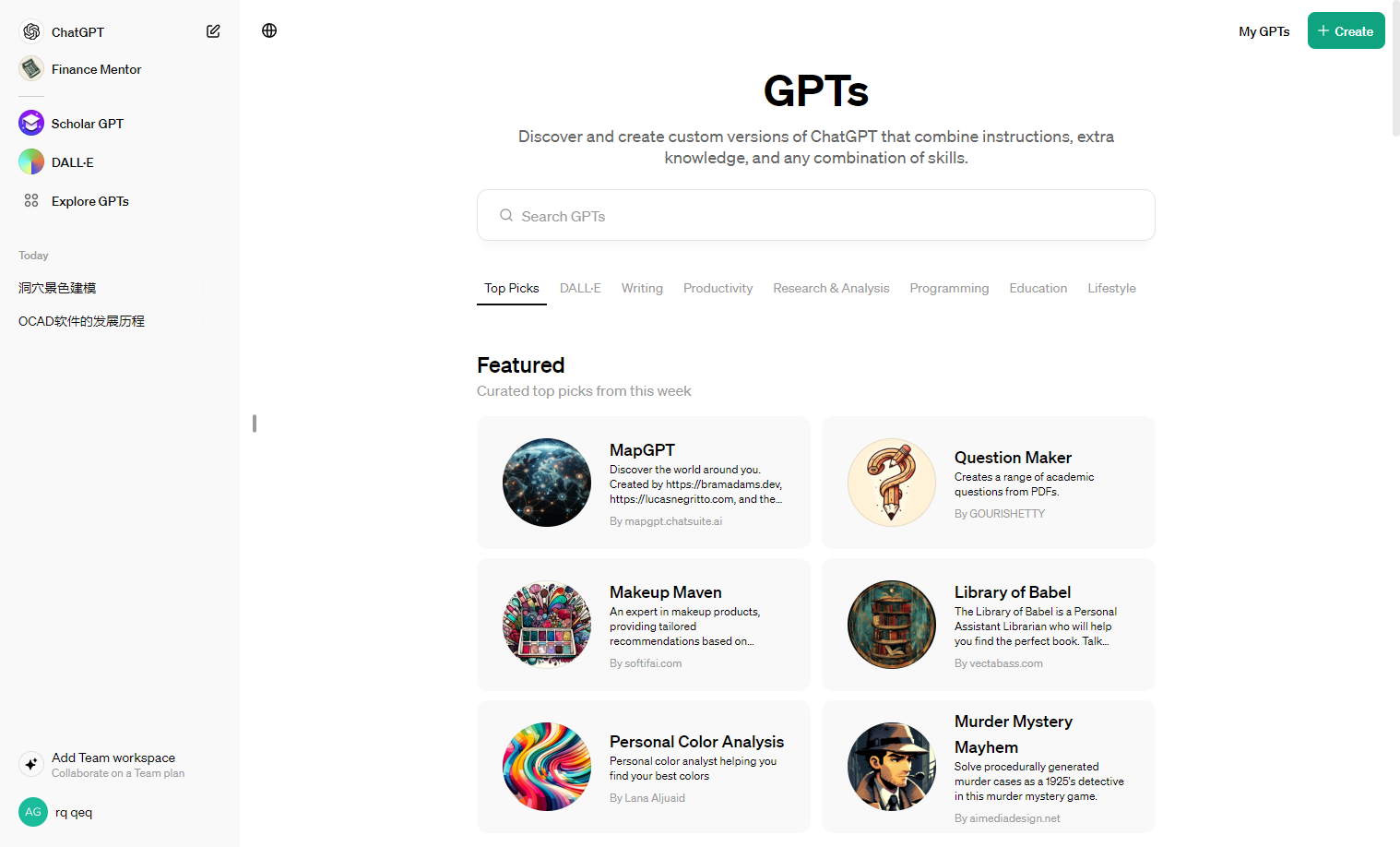 登录GPT4账号之后,在左上方即罗列出当前账号用过的GPTs,以及可以点击Explore GPTs来寻找更多其他功能的GPTs,这个很像苹果手机中的APP store应用商店,里面有各式各样的不同的应用。实际上,GPTs中的这个s就表示store商店的意思。