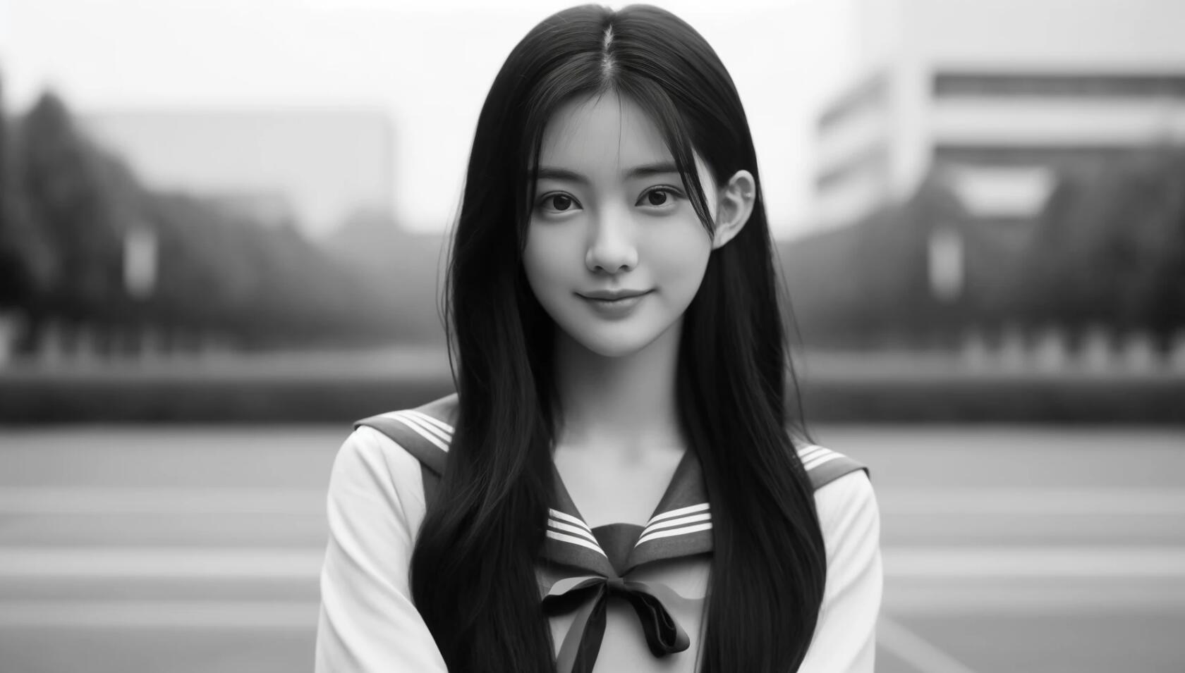 背景:室外,干净背景。主角:一个20岁的中国女性,正视镜头。脸部:神情平静柔和,嘴角微微上扬,甜美可爱。发型:黑色长发垂下,露出一侧的耳朵。服装:学生风格穿搭。姿势:站立,双手交叉放在身前,乖顺形象。风格:黑白照片,电影截图质感。分辨率:宽屏(1792*1024)显示