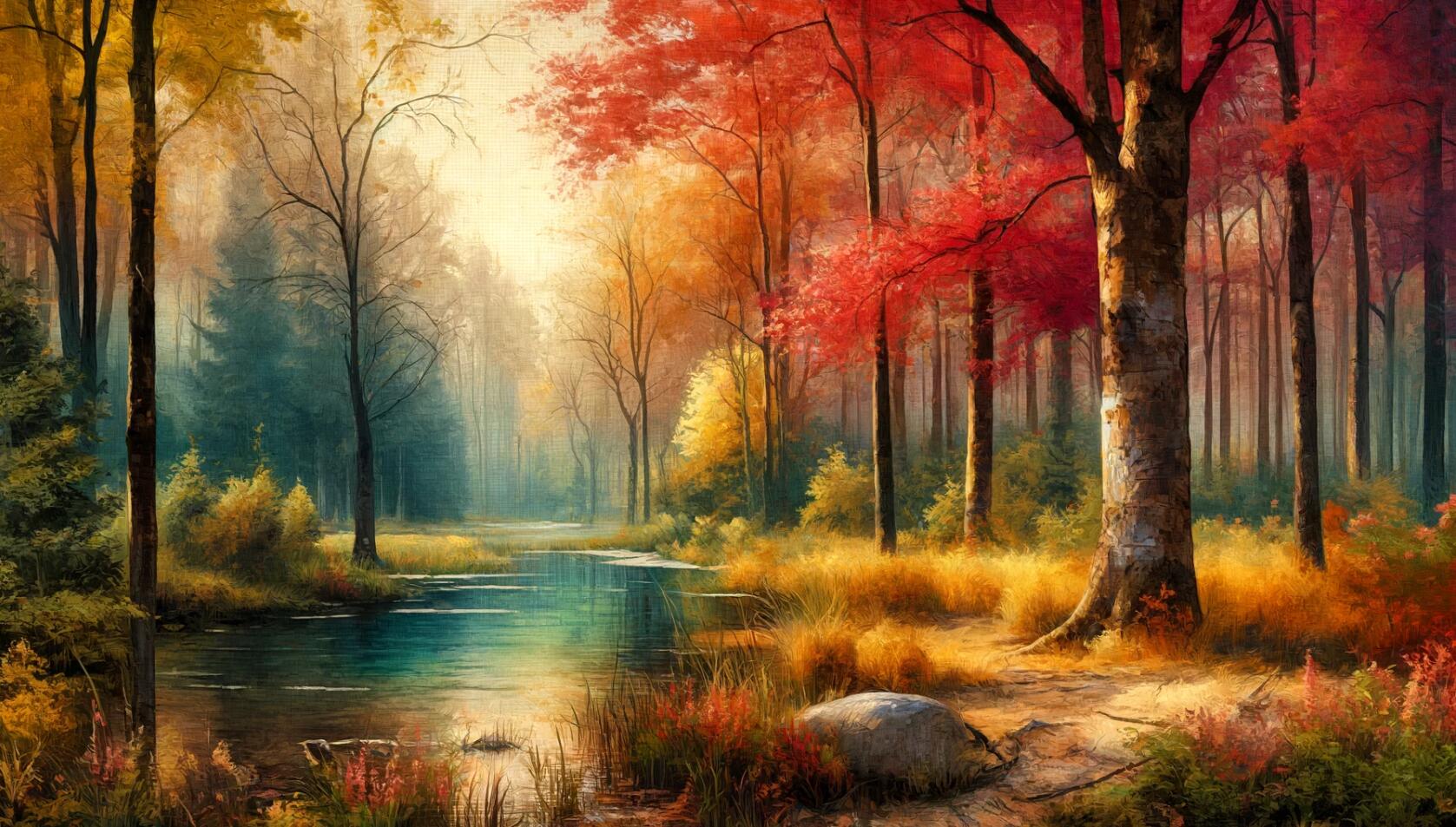 宽屏宽高比 秋天,一幅宁静的森林景观的数字绘画,捕捉色调和纹理,就像画在画布上一样。