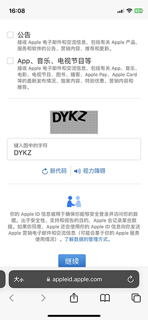 验证通过会直接跳转到Apple ID的登录页面中,偶尔还会出现无法进入验证邮箱和手机号这一步,则检查一下浏览器是否为无痕模式。