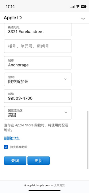 - 这里选择阿拉斯加州的地址,姓名、街道地址、城市、省市、邮编、电话号码均要填写。