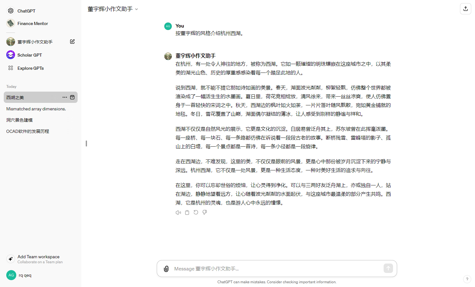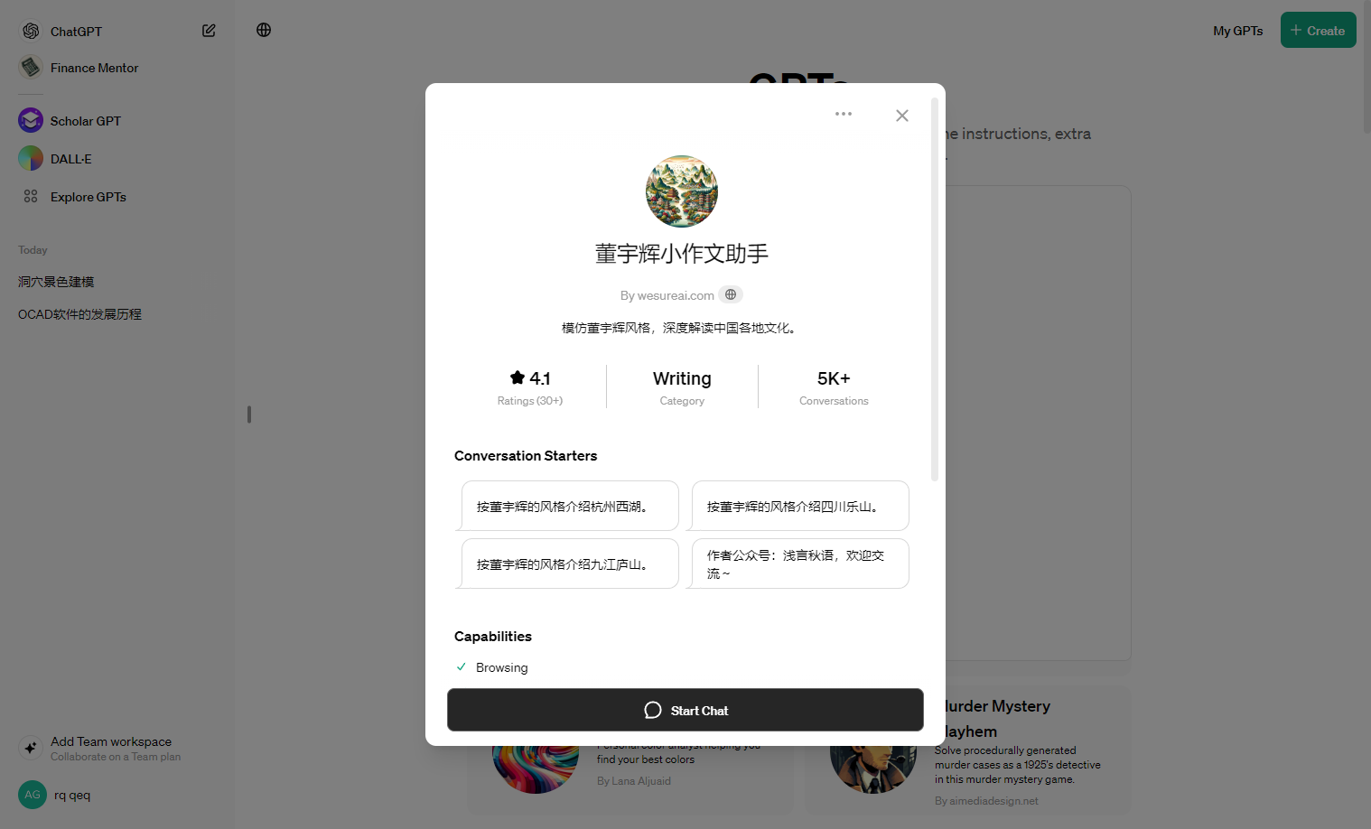 点击Explore GPTs,在搜索框内搜索董宇辉小作文助手,点击Start chat即可发起当前GPTs。届时当前页面左上角会由ChatGPT-4变成董宇辉小作文助手,说明加载成功。