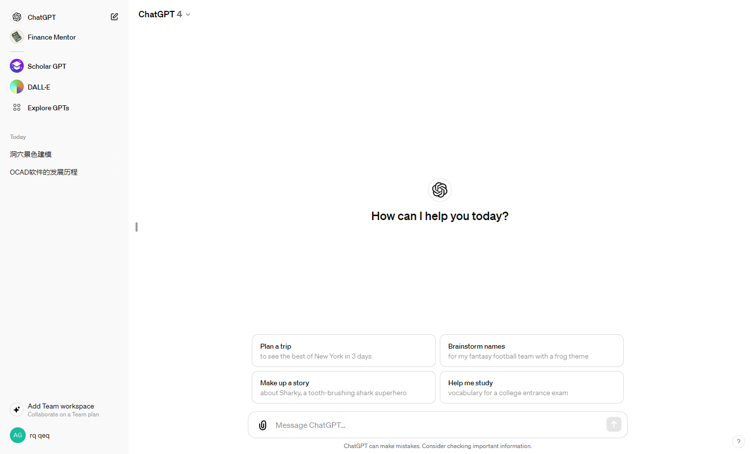 登录GPT4账号之后,在左上方即罗列出当前账号用过的GPTs,以及可以点击Explore GPTs来寻找更多其他功能的GPTs,这个很像苹果手机中的APP store应用商店,里面有各式各样的不同的应用。实际上,GPTs中的这个s就表示store商店的意思。