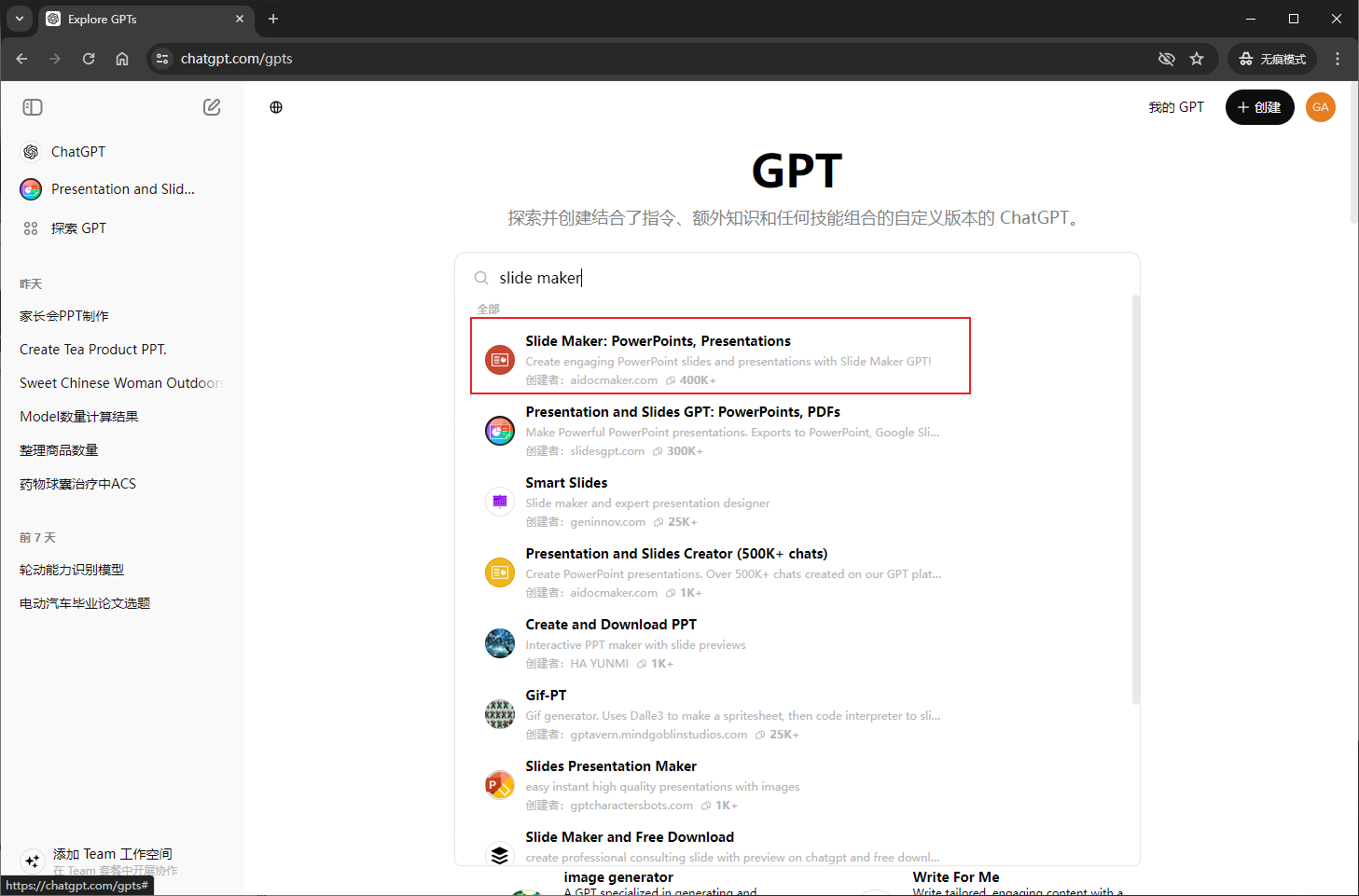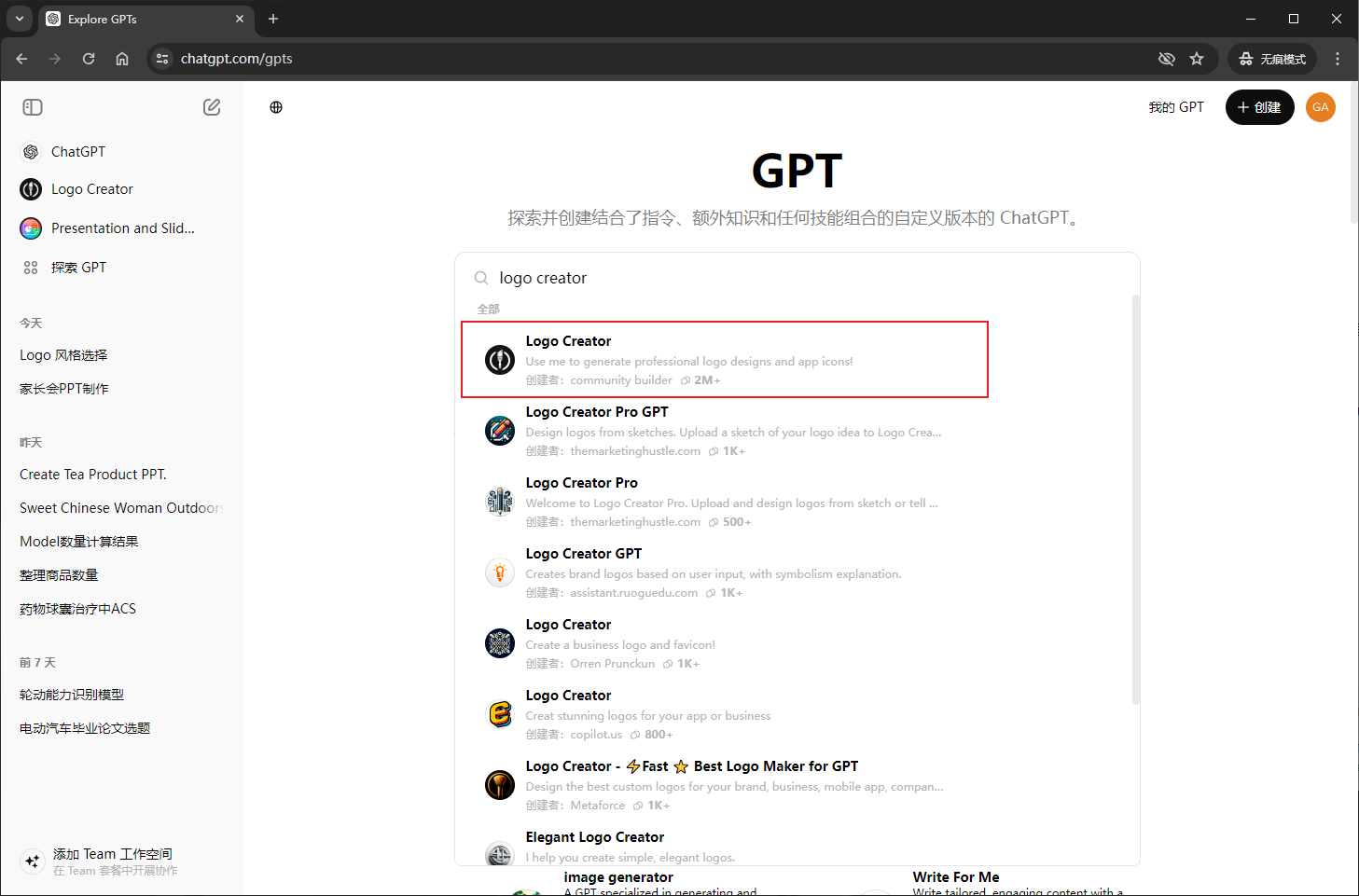 登录GPT4账号之后,在左上方即罗列出当前账号用过的GPTs,以及可以点击Explore GPTs来寻找更多其他功能的GPTs,这个很像苹果手机中的APP store应用商店,里面有各式各样的不同的应用。实际上,GPTs中的这个s就表示store商店的意思。