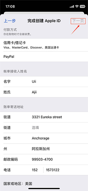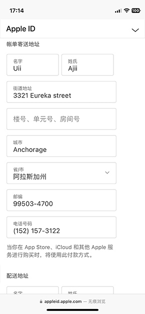 - 这里选择阿拉斯加州的地址,姓名、街道地址、城市、省市、邮编、电话号码均要填写。