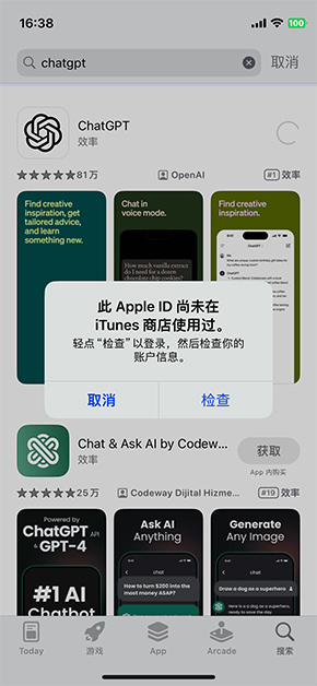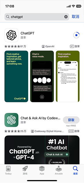 搜索chatgpt后,会出来一堆山寨的app,这里要注意甄别,如下图所示,这个图标,白色的,开发者是openai才是官方的app。